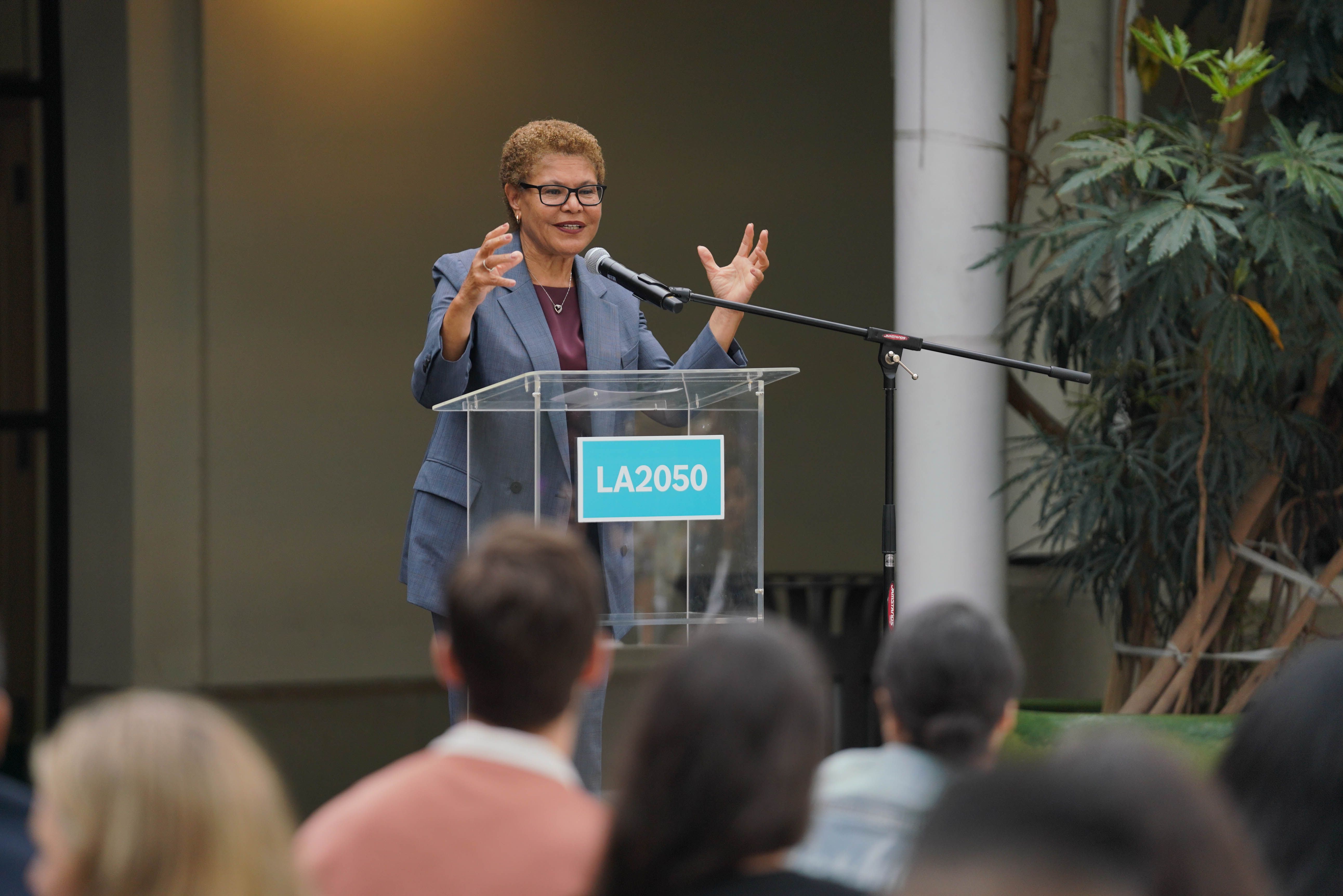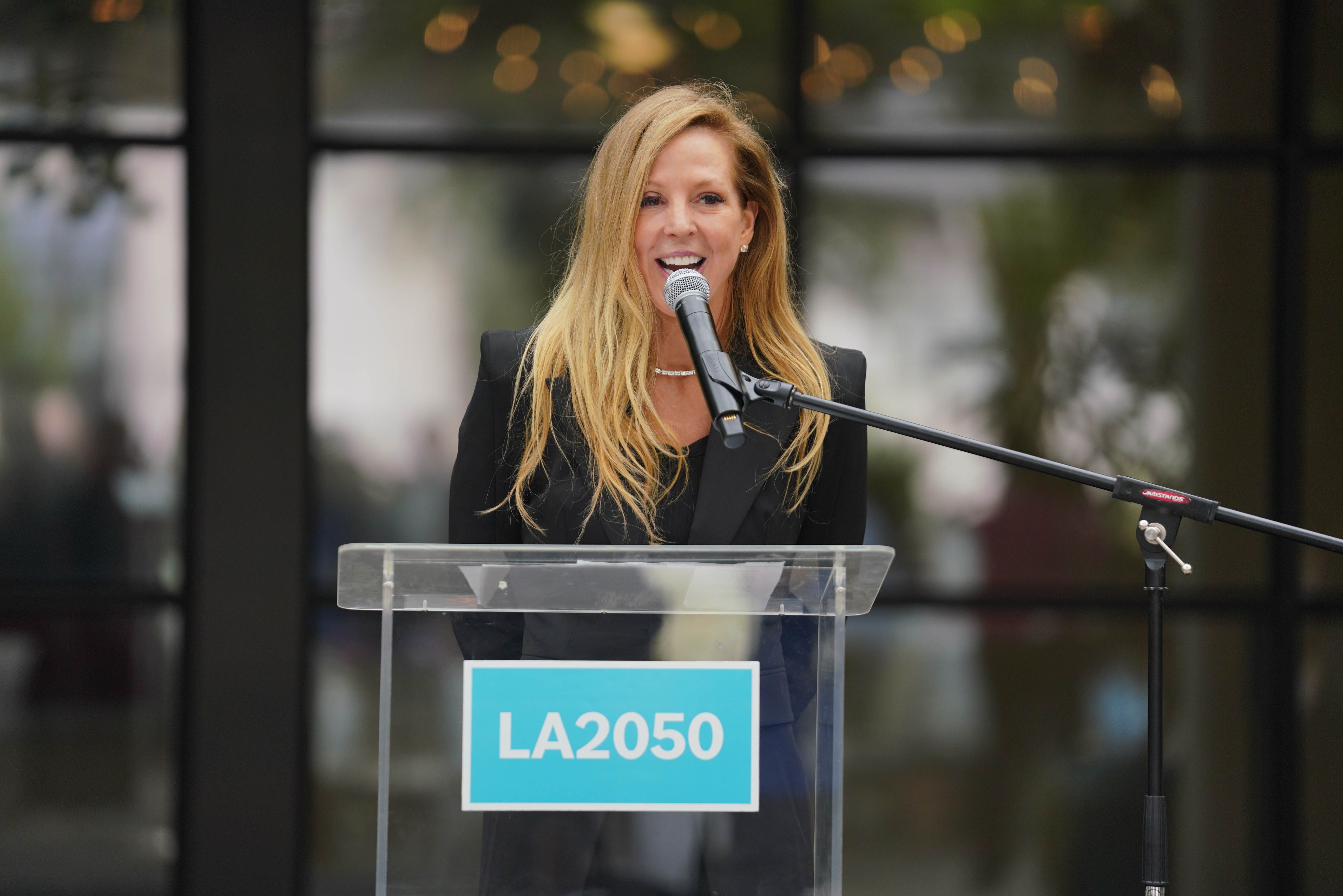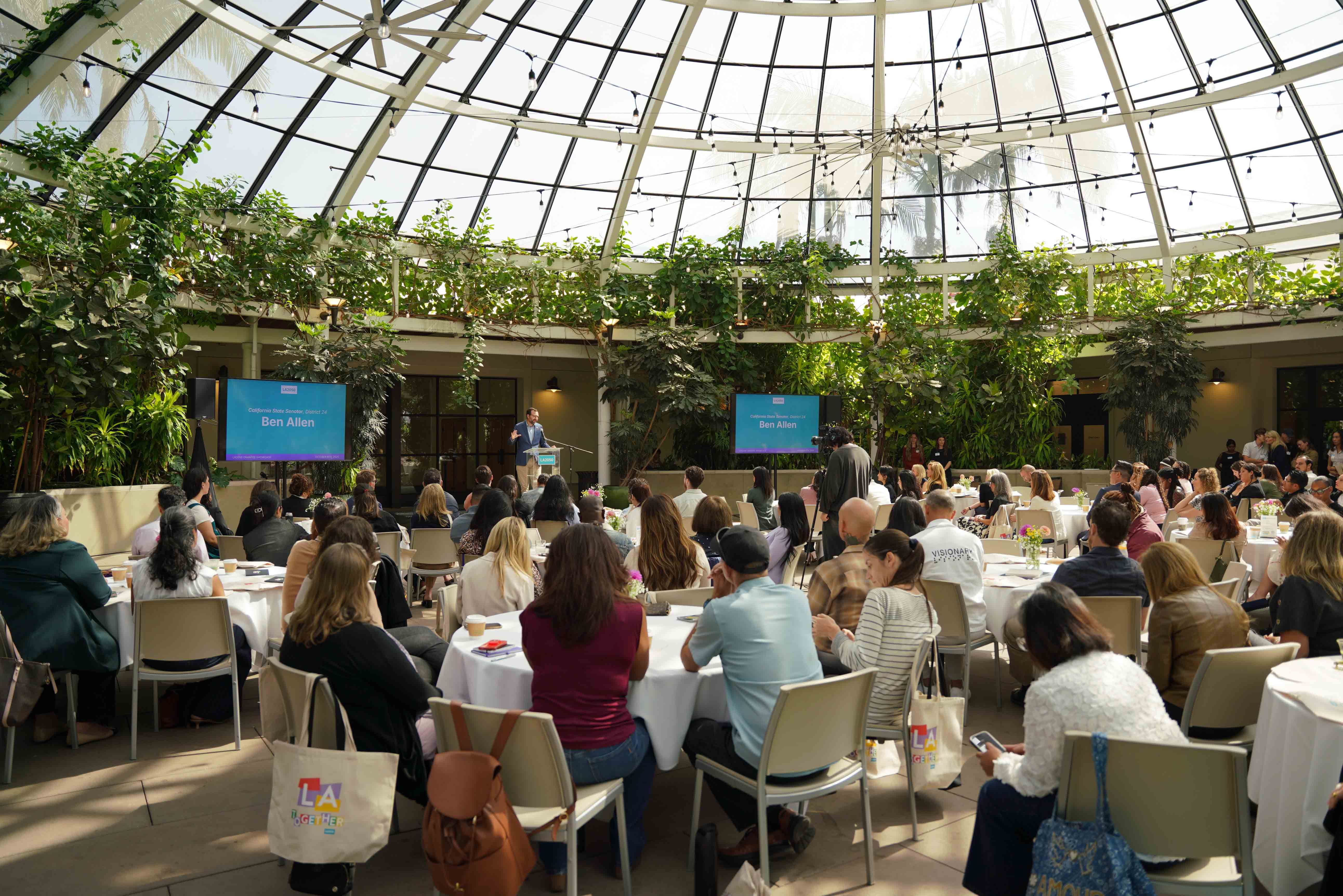 Grant recipients gathered this morning at The Huntington for the LA2050 Grantee Showcase, joined by civic leaders including Los Angeles Mayor Karen Bass and Los Angeles County Supervisor Kathryn Barger, who delivered keynote addresses. Bloomberg's Sarah McGregor served as emcee, while Snap Foundation executive director Joel Arquillos moderated a panel featuring previous LA2050 Grants Challenge recipients (Lost Angels Career Center, LA Más, Birthworkers of Color Collective, and Grid110).